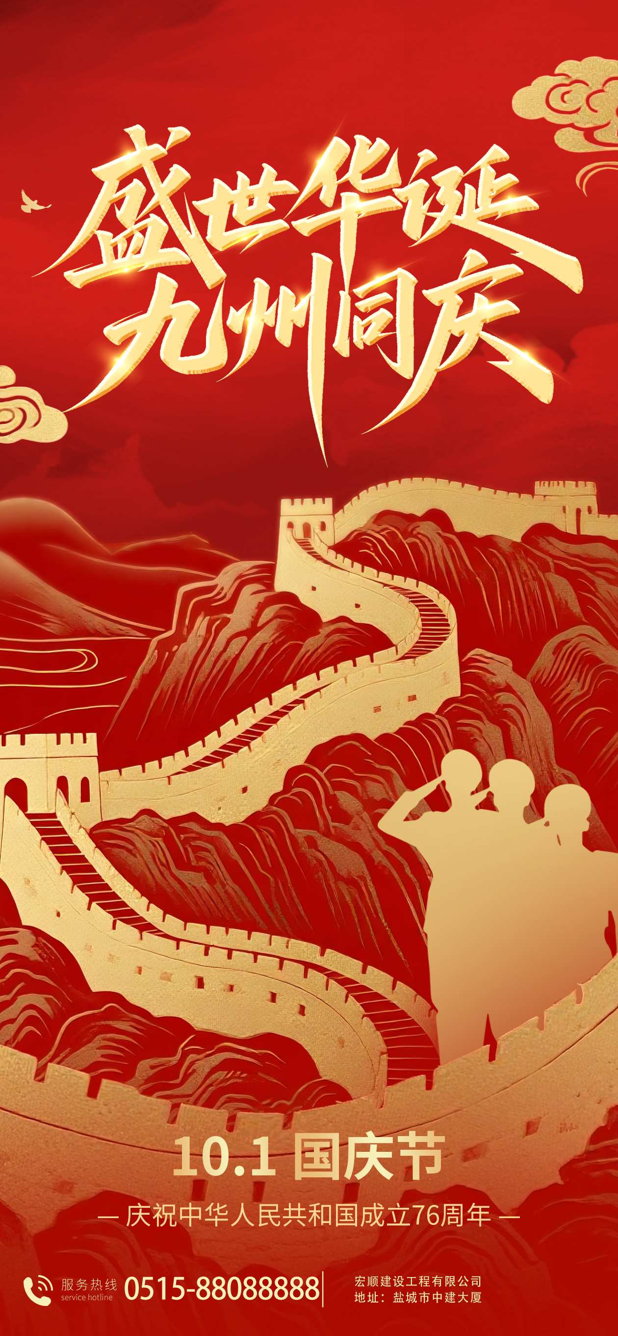 作為城市建設的筑夢者,我們深知每一棟拔地而起的高樓都凝聚著建設者的汗水,每一條延伸向遠方的道路都承載著時代的夢想。在這個特殊的日子里,我們不僅要為祖國的輝煌成就感到自豪,更要為能參與國家建設而感到無比光榮。國慶長假將至,愿各位在享受美好假期的同時,也能感受到我們最真摯的祝福。無論是與家人團聚的天倫之樂,還是外出游歷的愜意時光,都愿您收獲滿滿的幸福與歡樂。讓我們暫別繁忙的工作,在秋日的暖陽中積蓄力量,以更飽滿的熱情迎接未來的挑戰(zhàn)。宏順建設將始終秉持"質量為本、誠信立業(yè)"的企業(yè)精神,與您攜手共創(chuàng)美好明天。